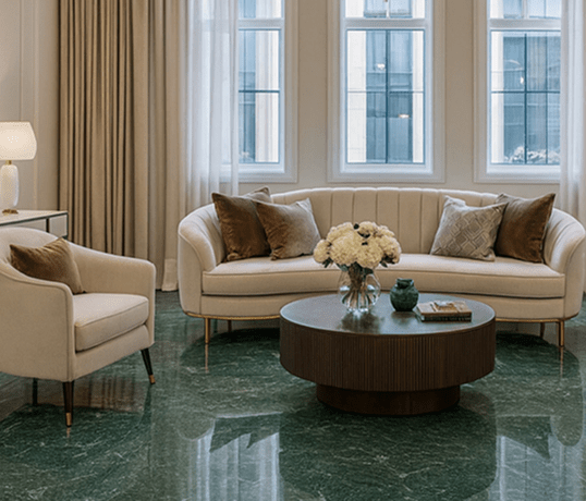 Green Marble is known for its deep green color enriched with natural patterns, adding a sense of richness and uniqueness to interiors.
