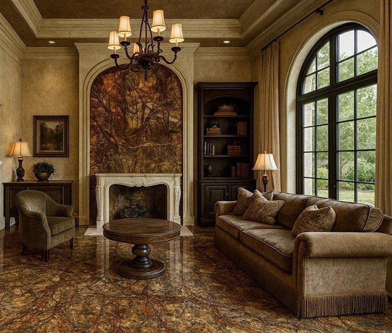 Rainforest Brown Marble features striking brown tones with intricate tree-like veining that creates a dramatic and natural appearance. Its bold patterns give any space a unique and earthy charm that stands out instantly.