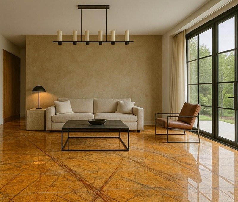 Rainforest Gold Marble showcases warm golden tones intertwined with bold, tree-like brown and grey veins that create a striking and earthy visual appeal. Its natural patterns bring a sense of richness and character to interiors where a unique and luxurious look is desired.